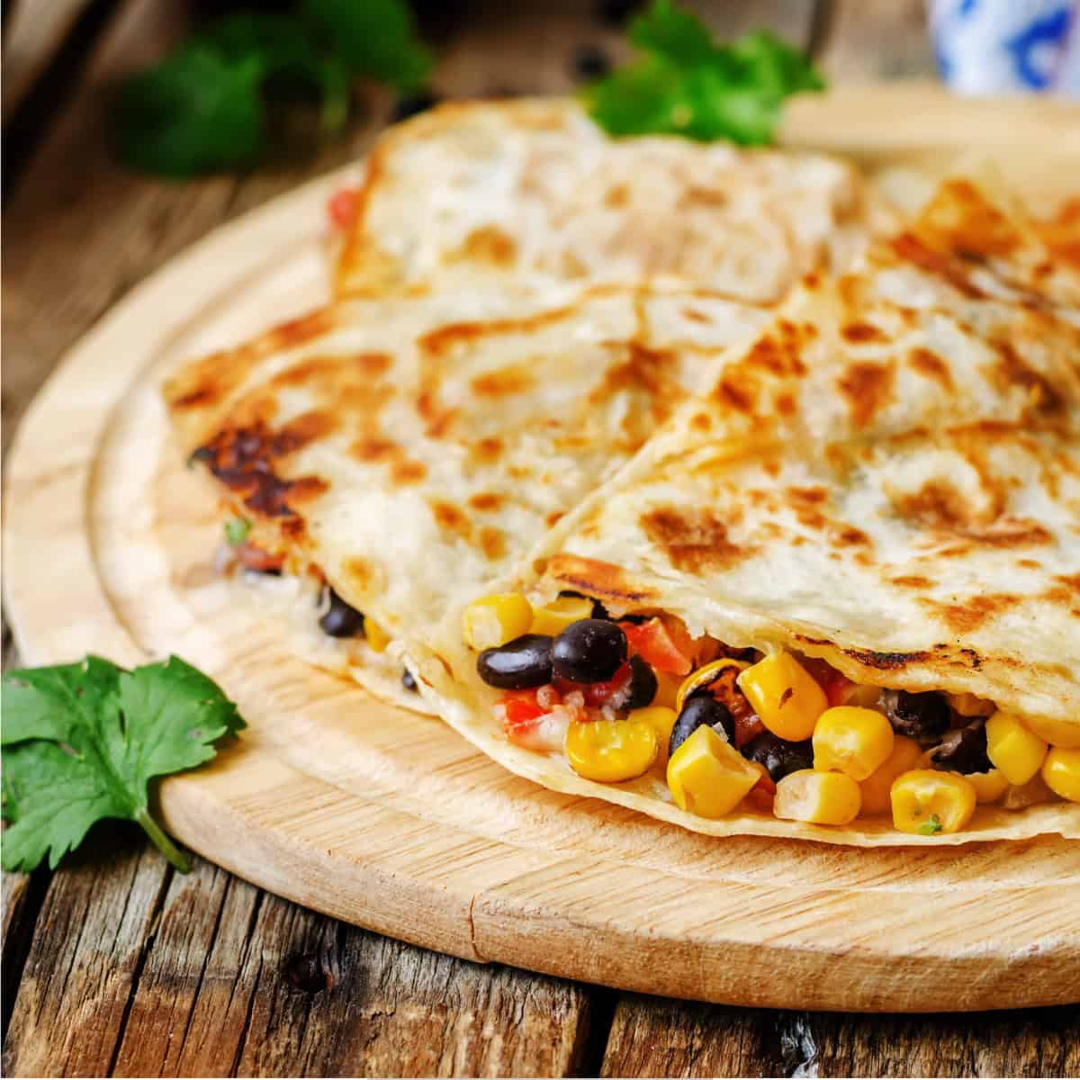 Black Bean Quesadilla cut into pieces on a round cutting board
