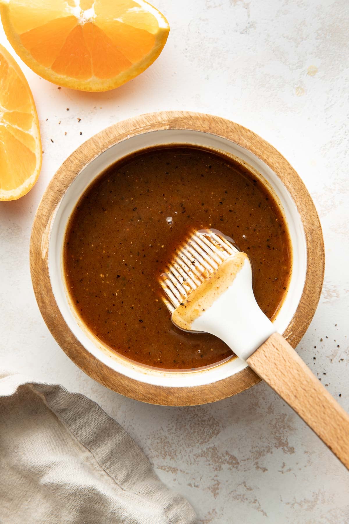 Overhead view of a small dish filled with Ham Glaze mixture next to sliced oranges.
